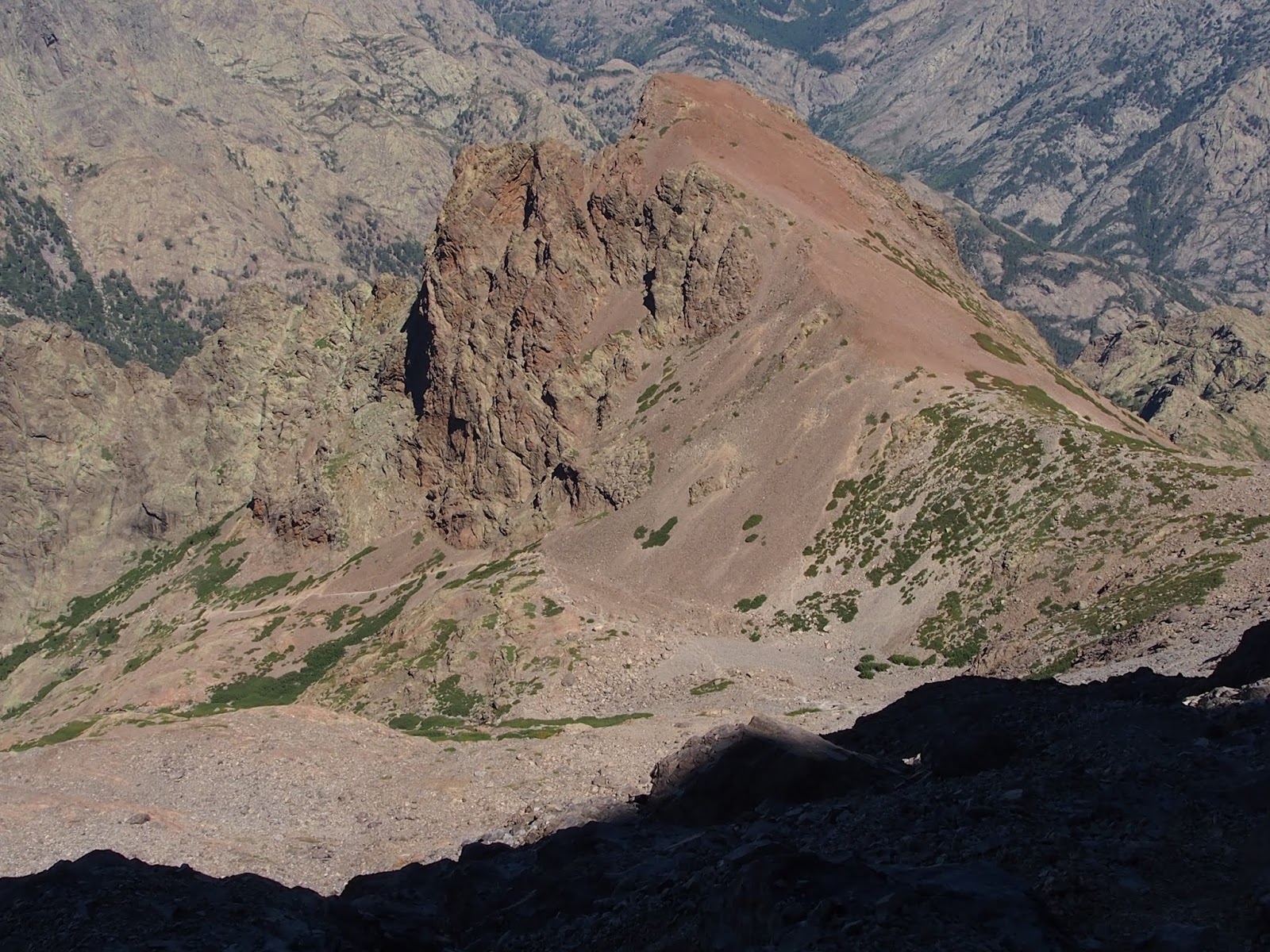My na przełęczy odpoczęliśmy trochę, o dziwo tam nie wiało, zjedliśmy, zastanawialiśmy się czy wejść na sam wierzchołek Monte Cinto, był właściwie w zasięgu ręki, jakieś 40 min dojścia, pogoda była dobra, siły też mieliśmy, ale liczyłam drogę, która pozostała do Calacucci, wybór był taki: albo Monte Cinto i pewnie wtedy udało by nam się zejść najwyżej do Refuge d'Erco, gdzie właściwie nic nie ma, albo rezygnujemy ze szczytu i zaczynamy już schodzić wtedy mieliśmy szansę dojść do Calacucci gdzie będzie sklep i jakiś lepszy nocleg.